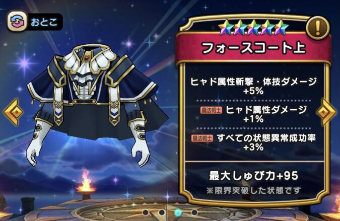 魔法戦士が戦闘にて火力を上げられるスキルを計3つも習得できるため、魔法戦士特化の防具と言える。同時ピックアップ登場した新武器との相性もいい。